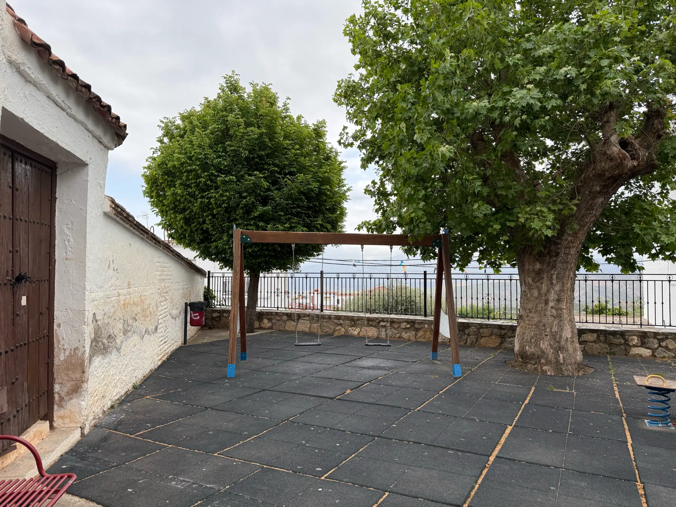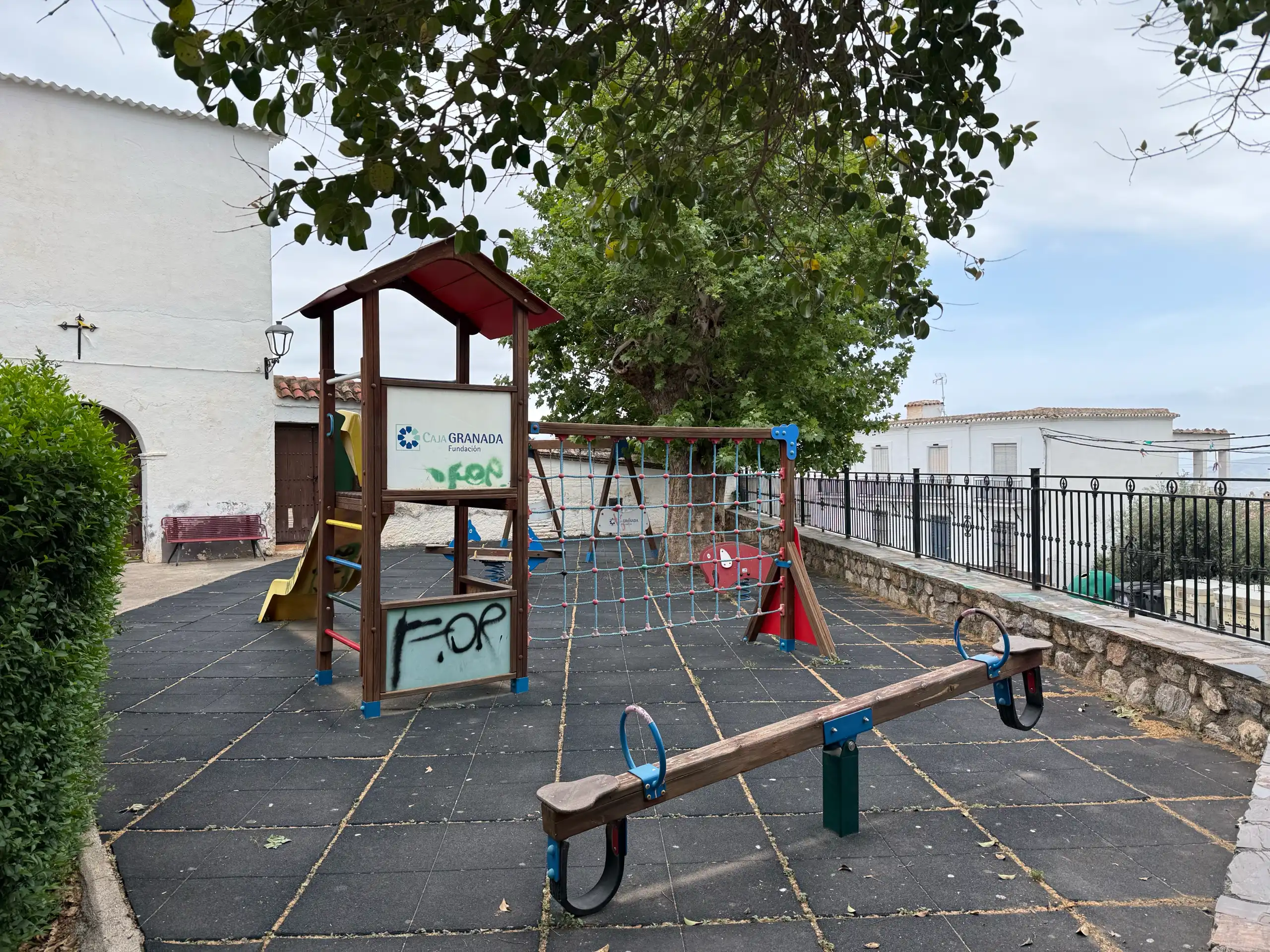 Este parque cuenta con una cuidada selección de juegos infantiles, como un balancín, un tobogán y una divertida red para trepar, ideales para estimular la actividad física, la imaginación y la convivencia entre niños.
