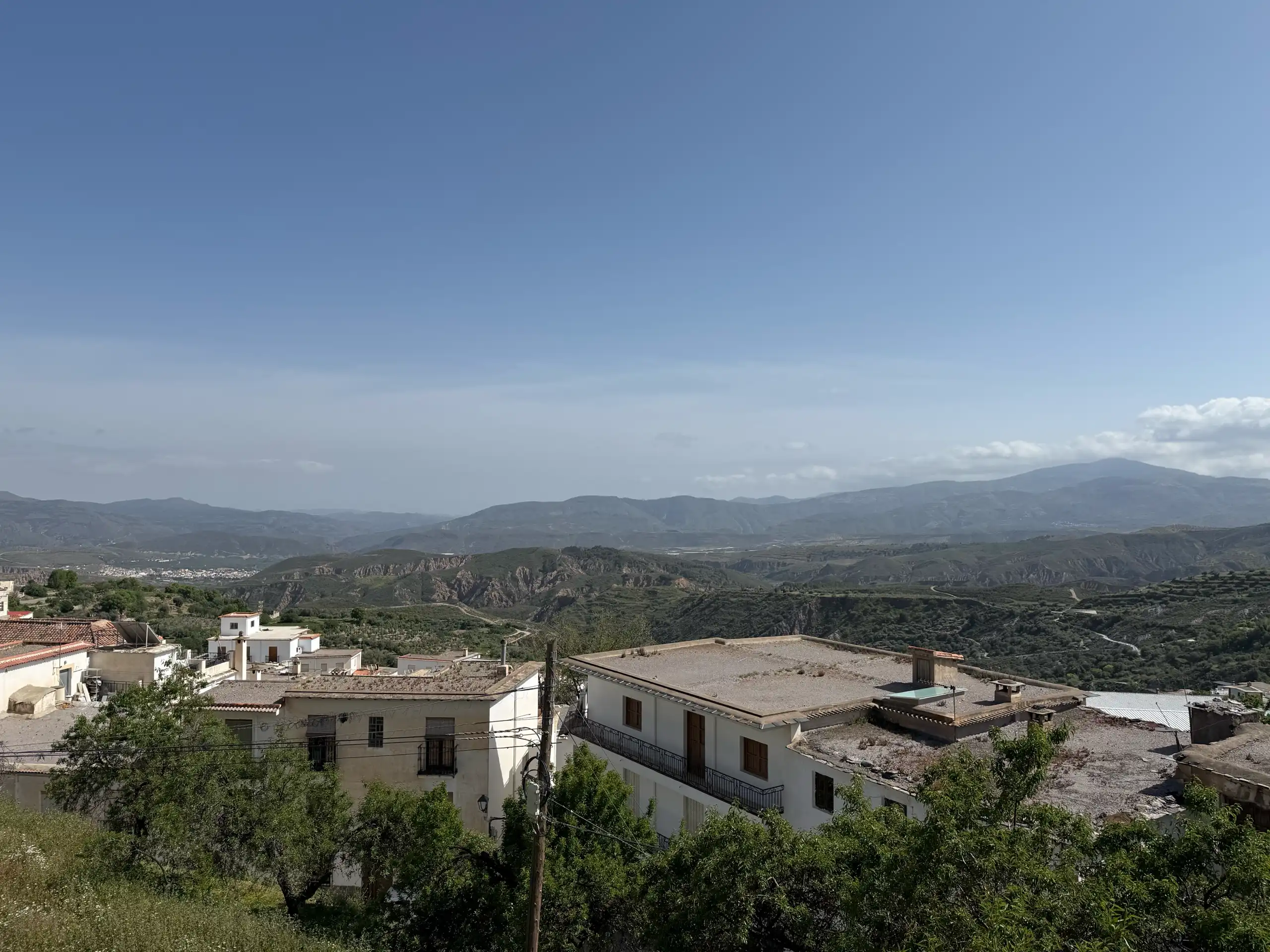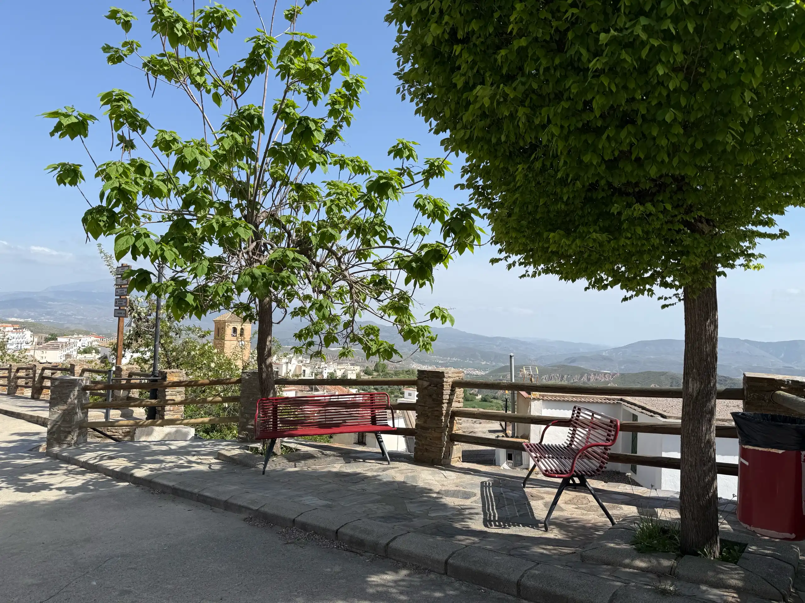 El mirador permite apreciar la riqueza paisajística de la Alpujarra granadina, con sus barrancos, terrazas agrícolas y la majestuosidad de Sierra Nevada al fondo.
