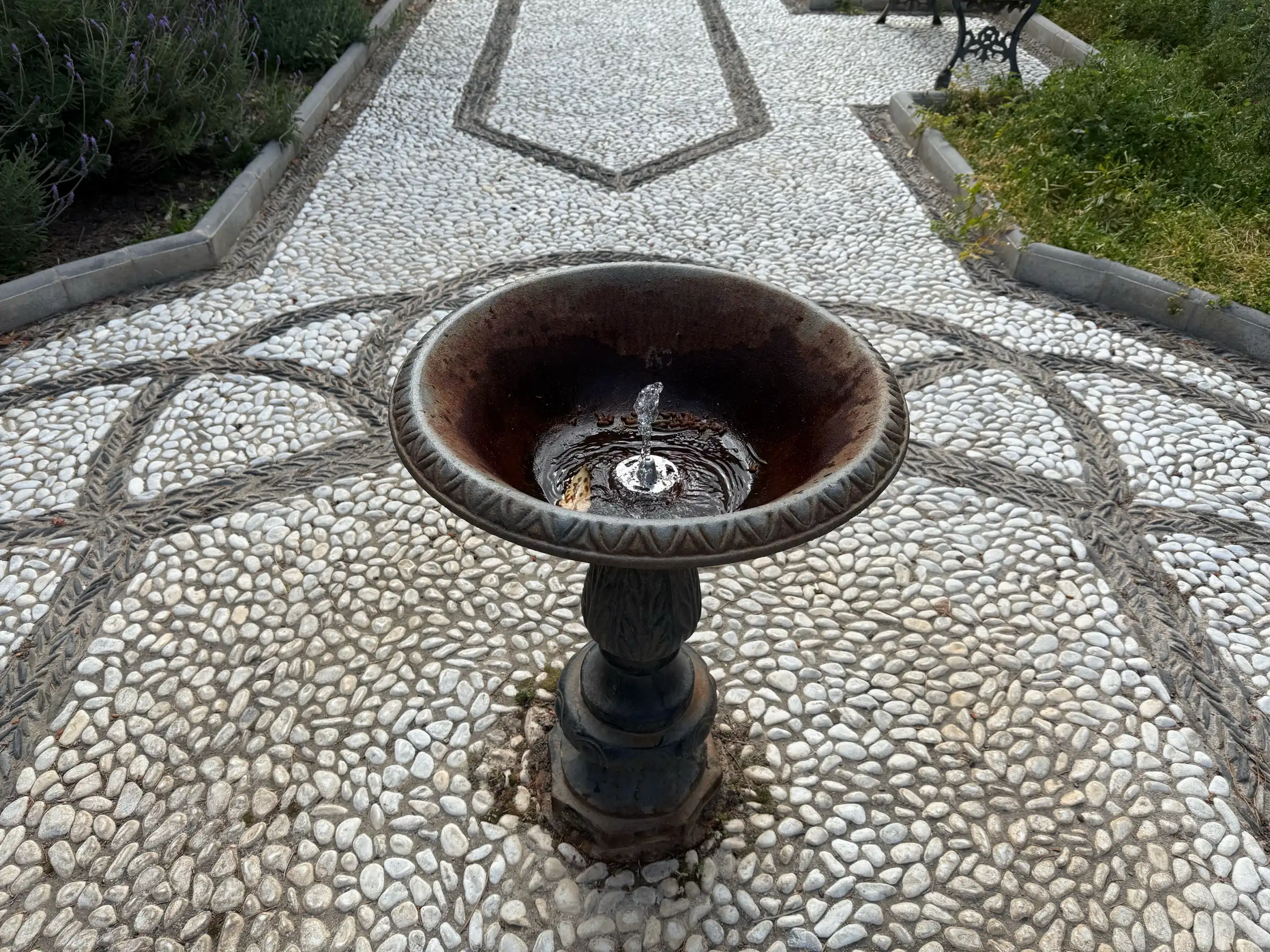 El jardín se organiza en tres plataformas a distinta altura, conectadas por peldaños cómodos y delimitadas por muros con empedrado granadino.