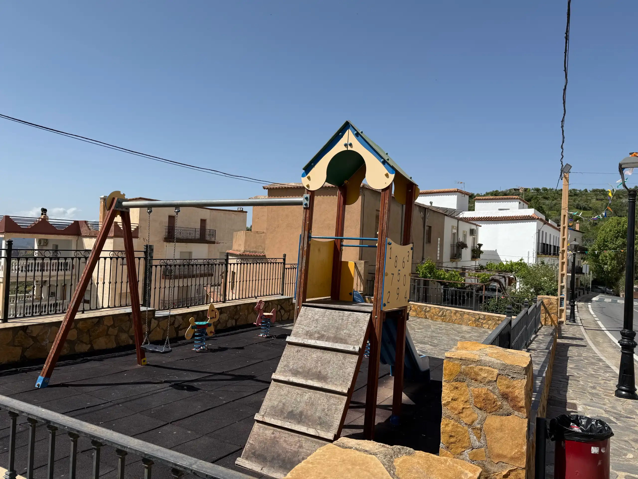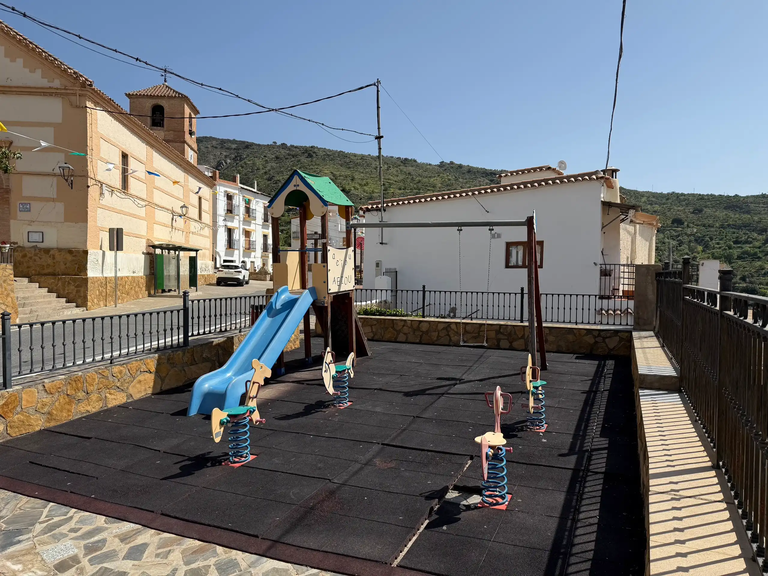Rodeado de arquitectura tradicional y del ambiente sereno de Mecina Alfahar, este parque infantil no solo cumple una función lúdica, sino que también contribuye a la vida social del pueblo, sirviendo como lugar de encuentro para familias y visitantes.